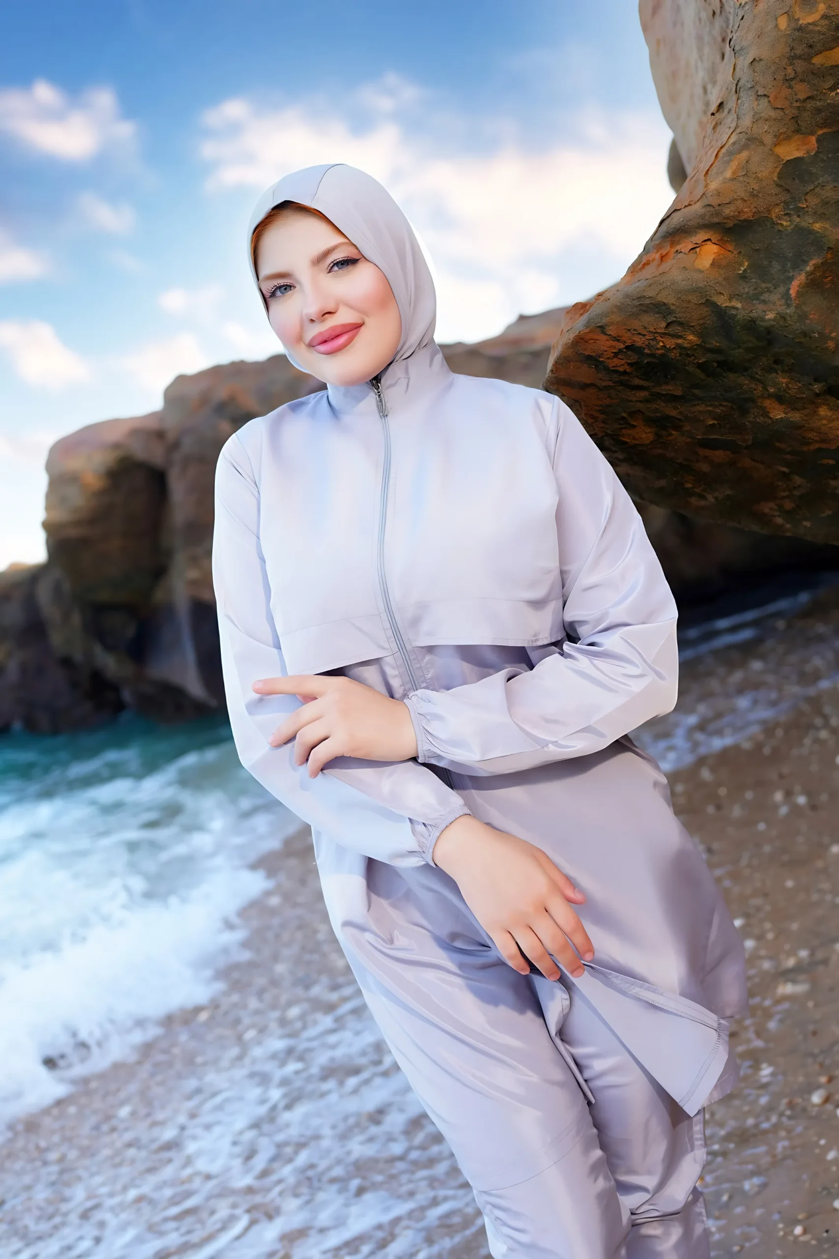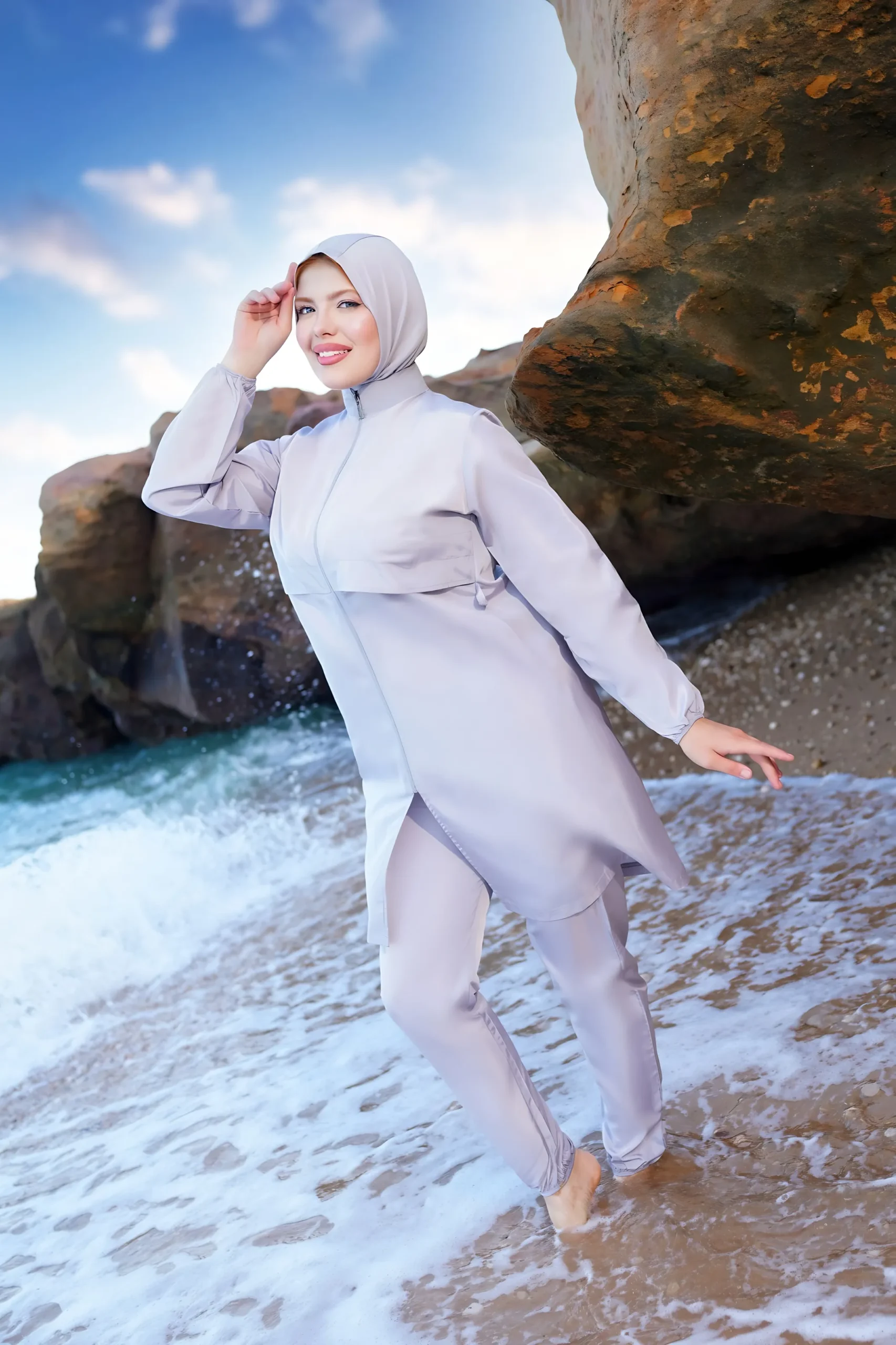 طقم ملابس السباحة المحتشم هذا، المصنوع من مادة مقاومة للماء، يقدم حلاً شاملاً ومريحاً لأيامك على الشاطئ