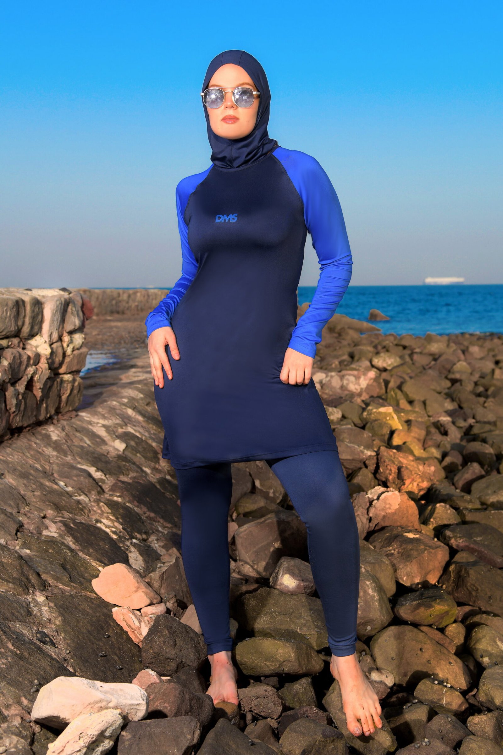 3-piece burkini set: a sleeveless jumpsuit, a long-sleeved tunic with colored arms, and a hijab.
