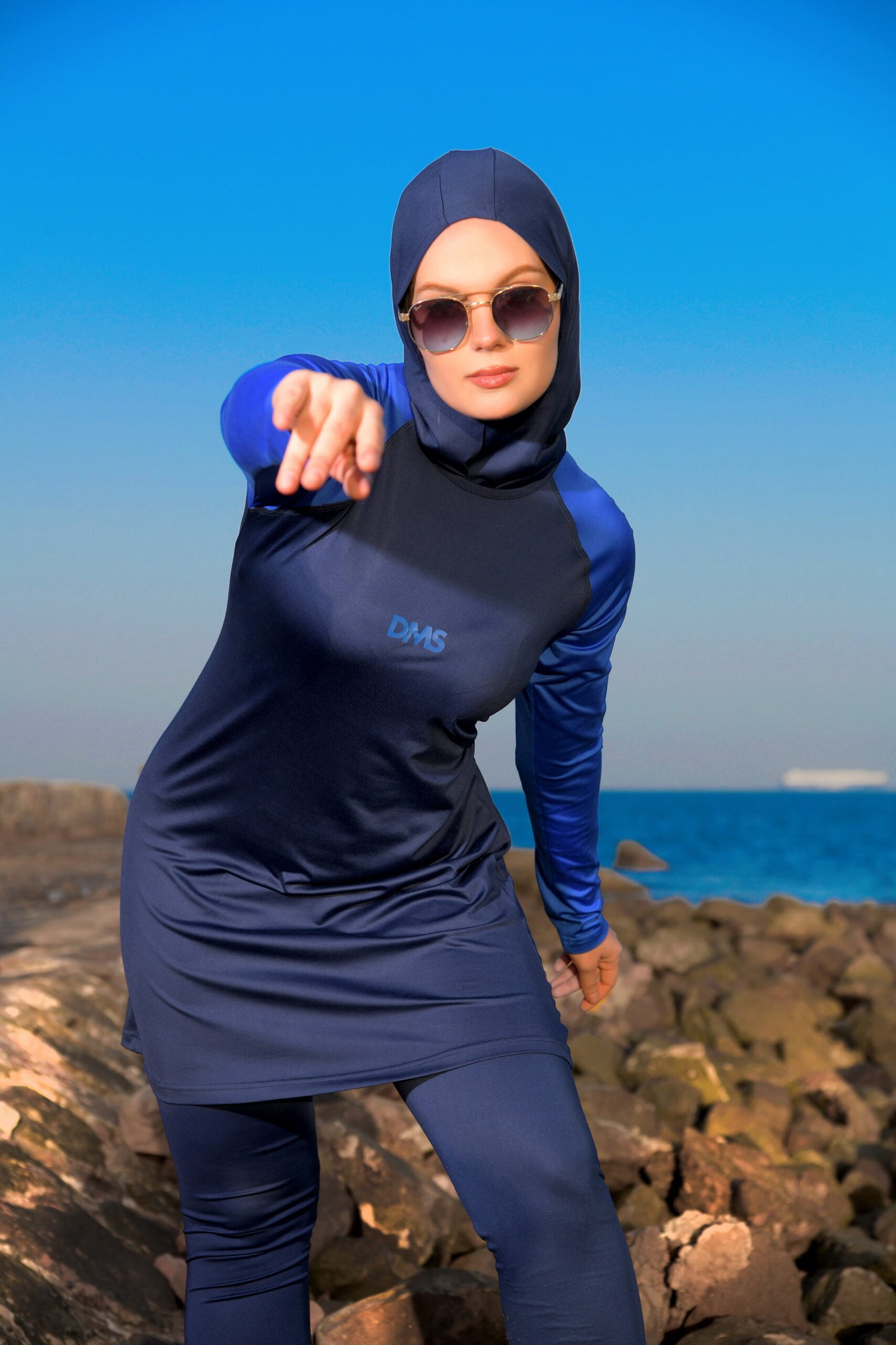 • It’s a 3-piece set: a sleeveless jumpsuit, a long-sleeved tunic with colored arms, and a hijab.