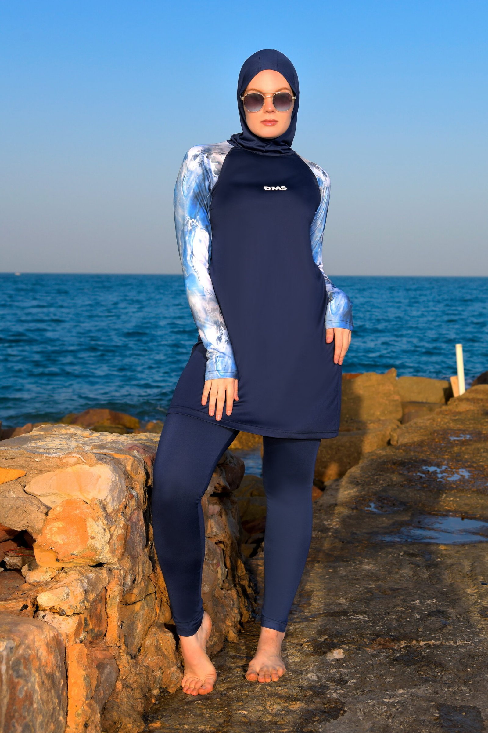 • It’s a 3-piece set: a sleeveless jumpsuit, a long-sleeved tunic with colored arms, and a hijab.