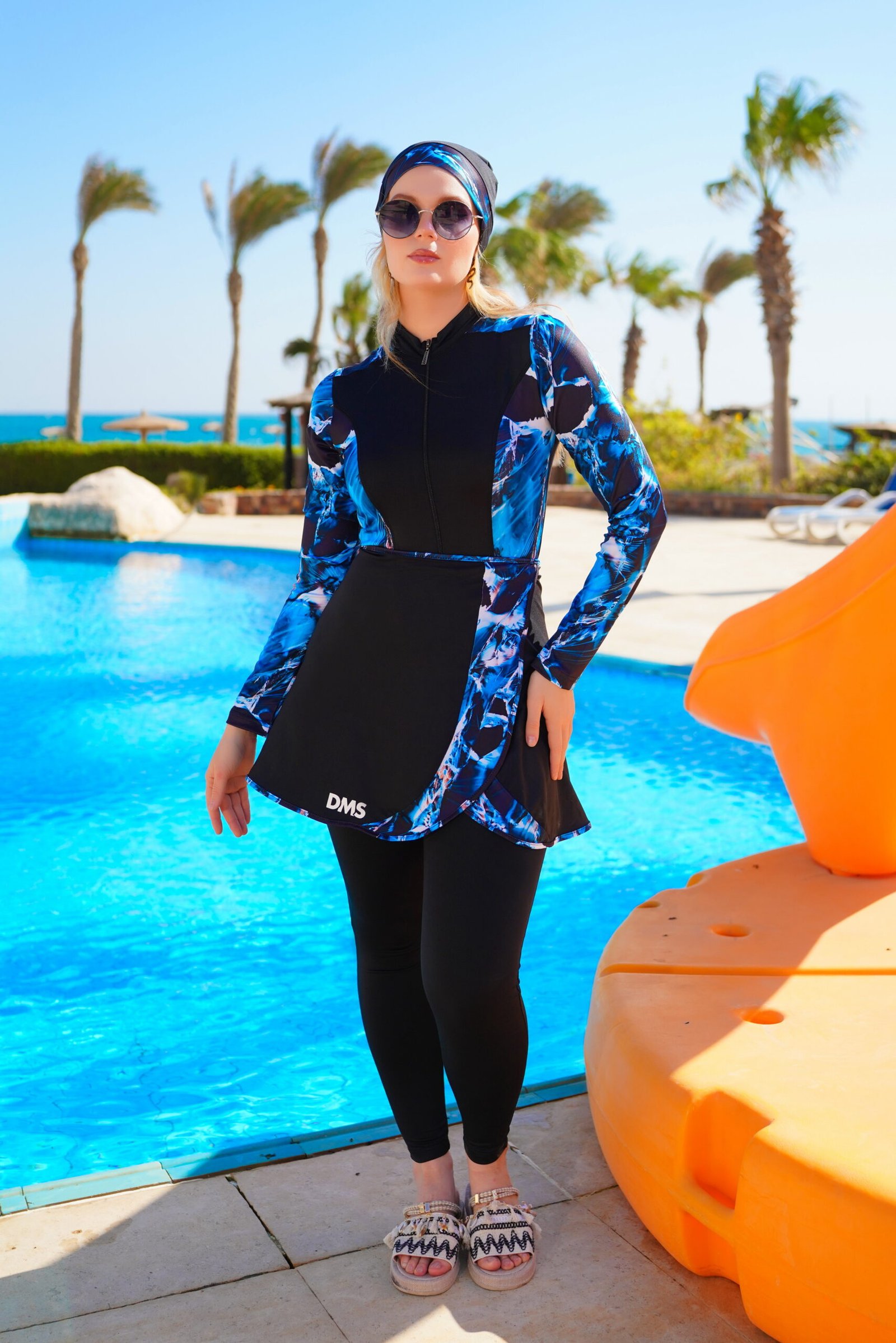 • It’s a 3-piece set: a full swimsuit, a skirt, and a headcover.