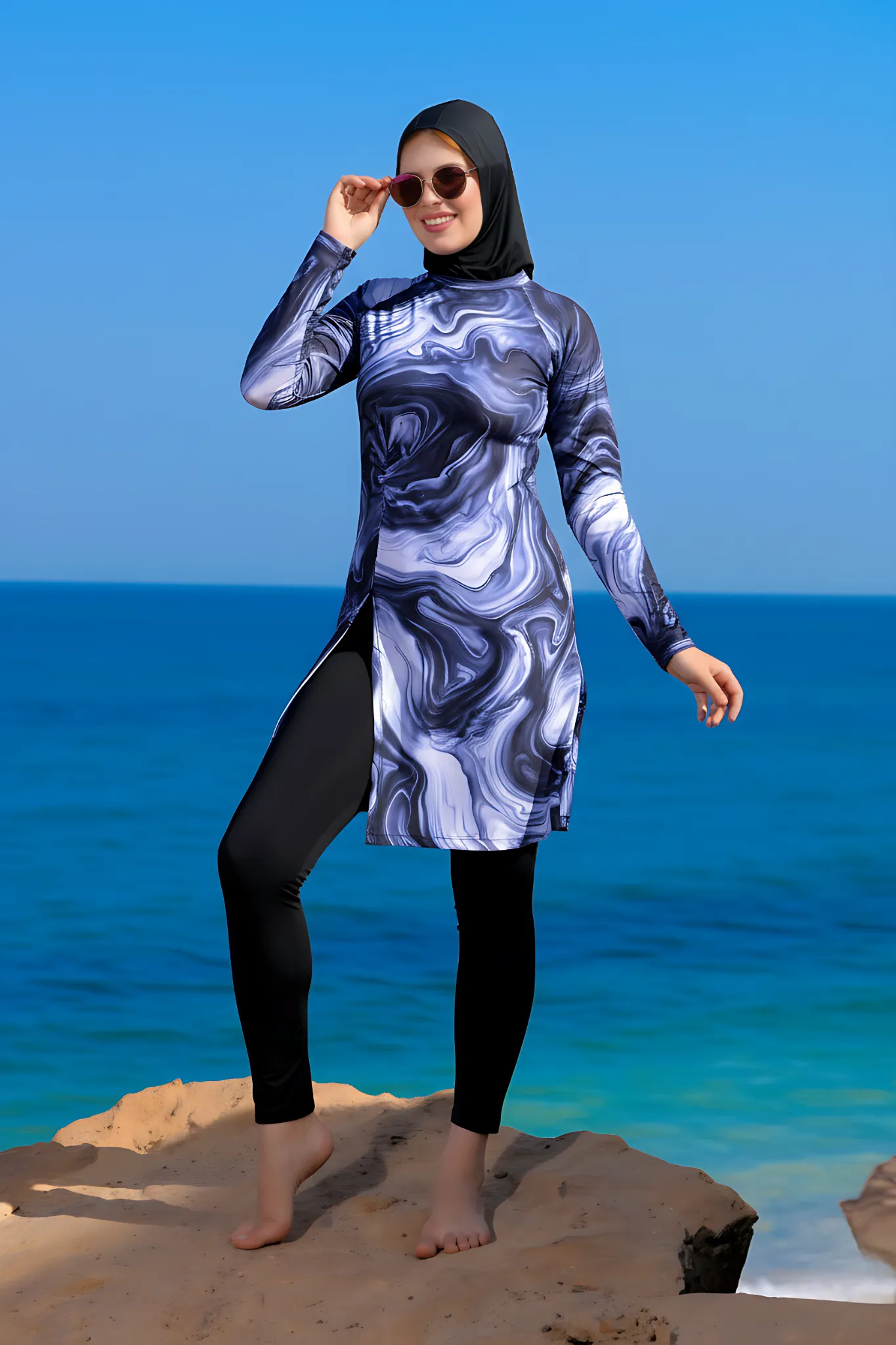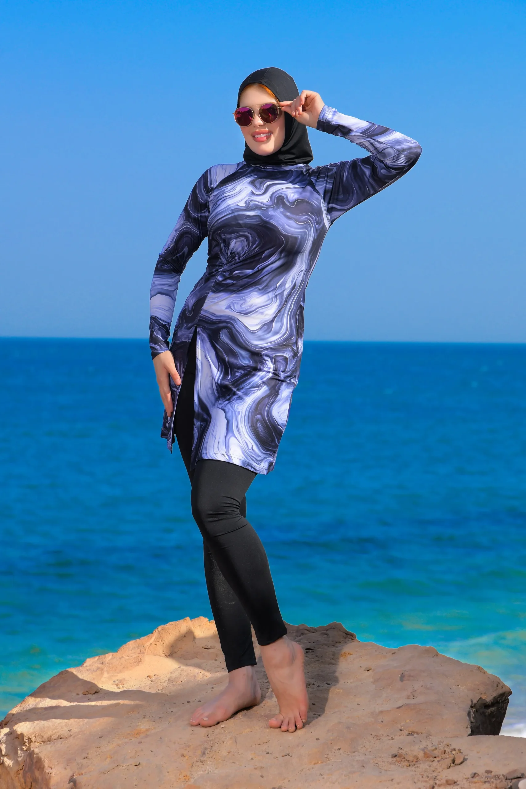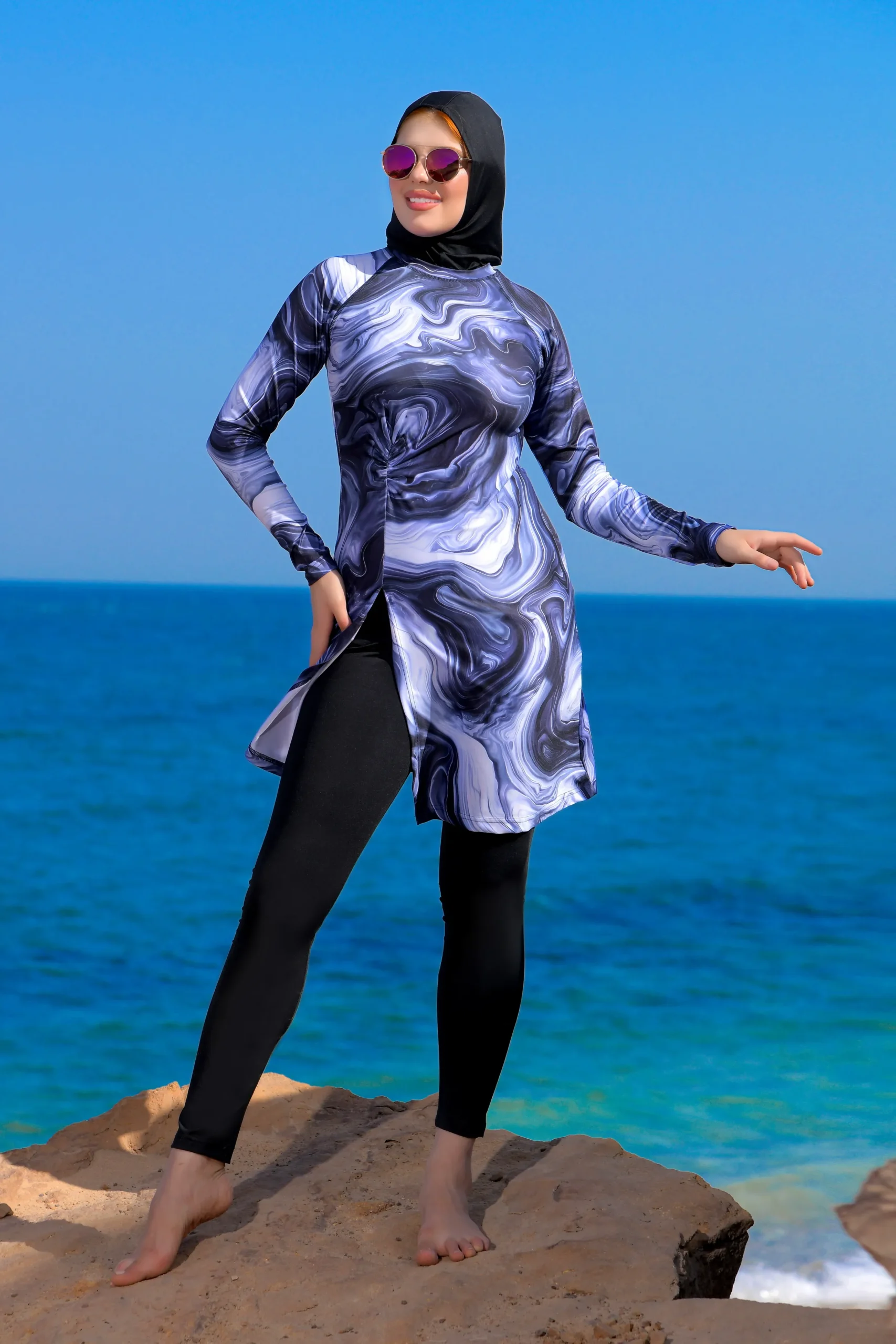 Look chic and fashionable in modest swimwear.