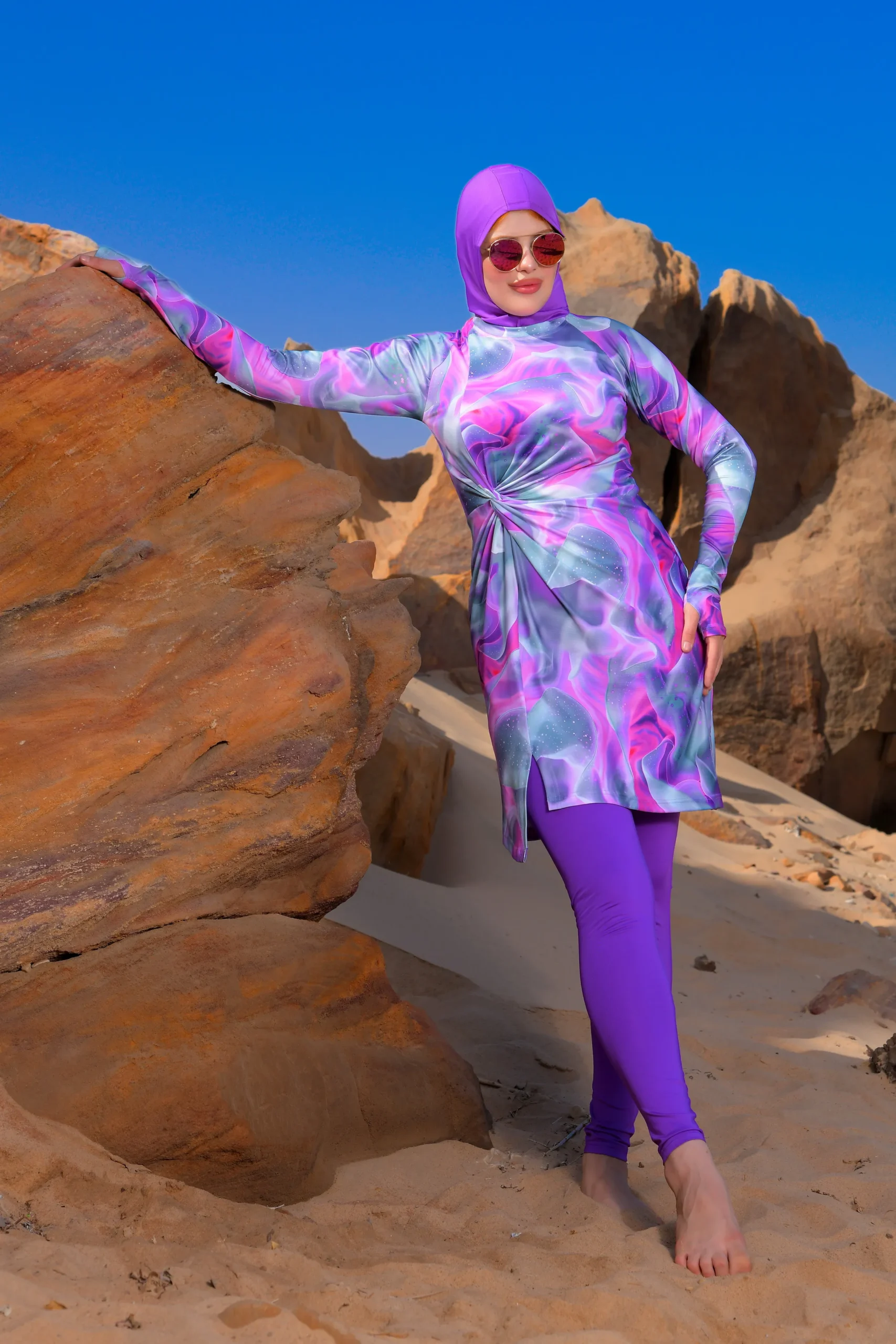 Look chic and fashionable in modest swimwear.