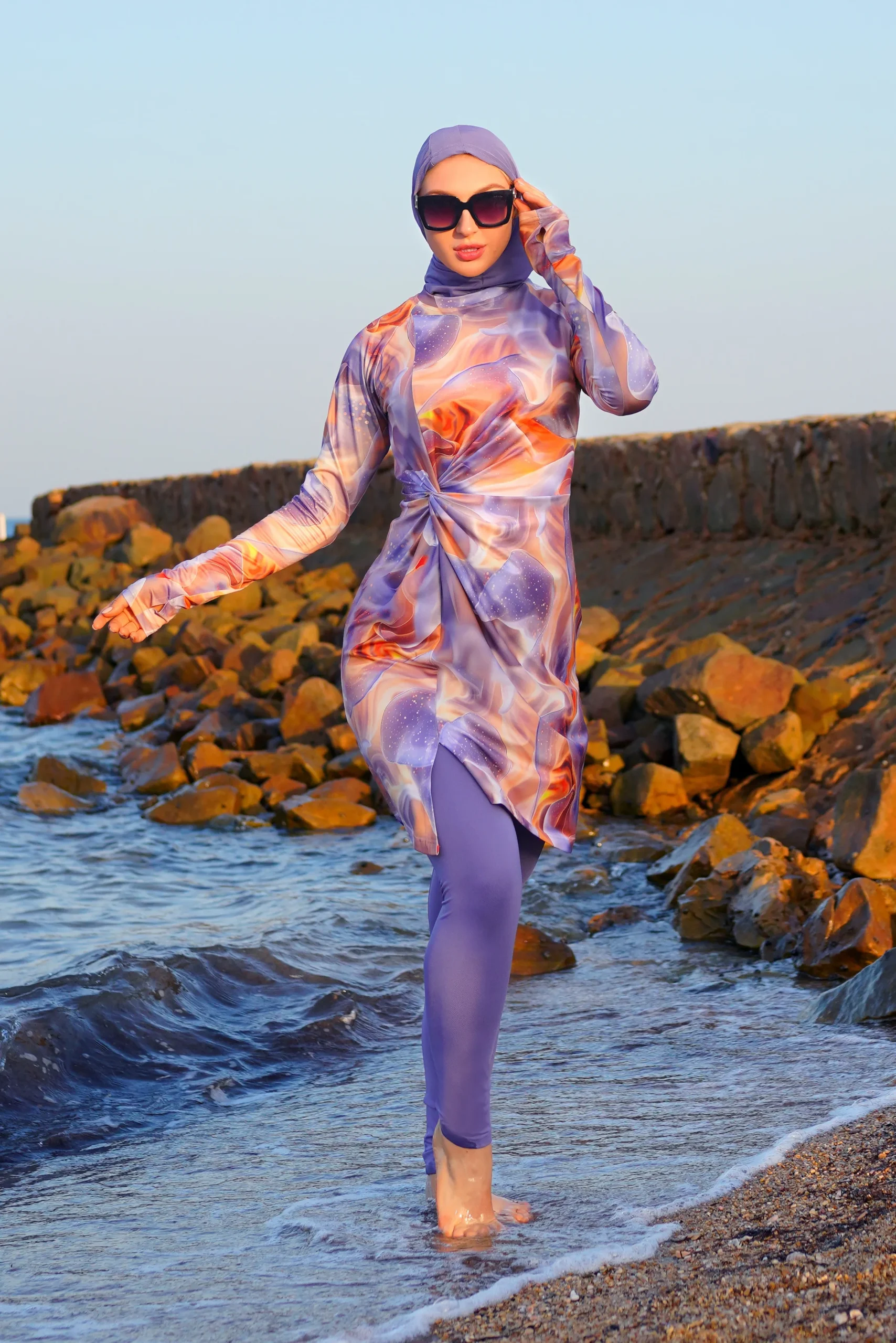 • Look chic and fashionable in modest swimwear.
