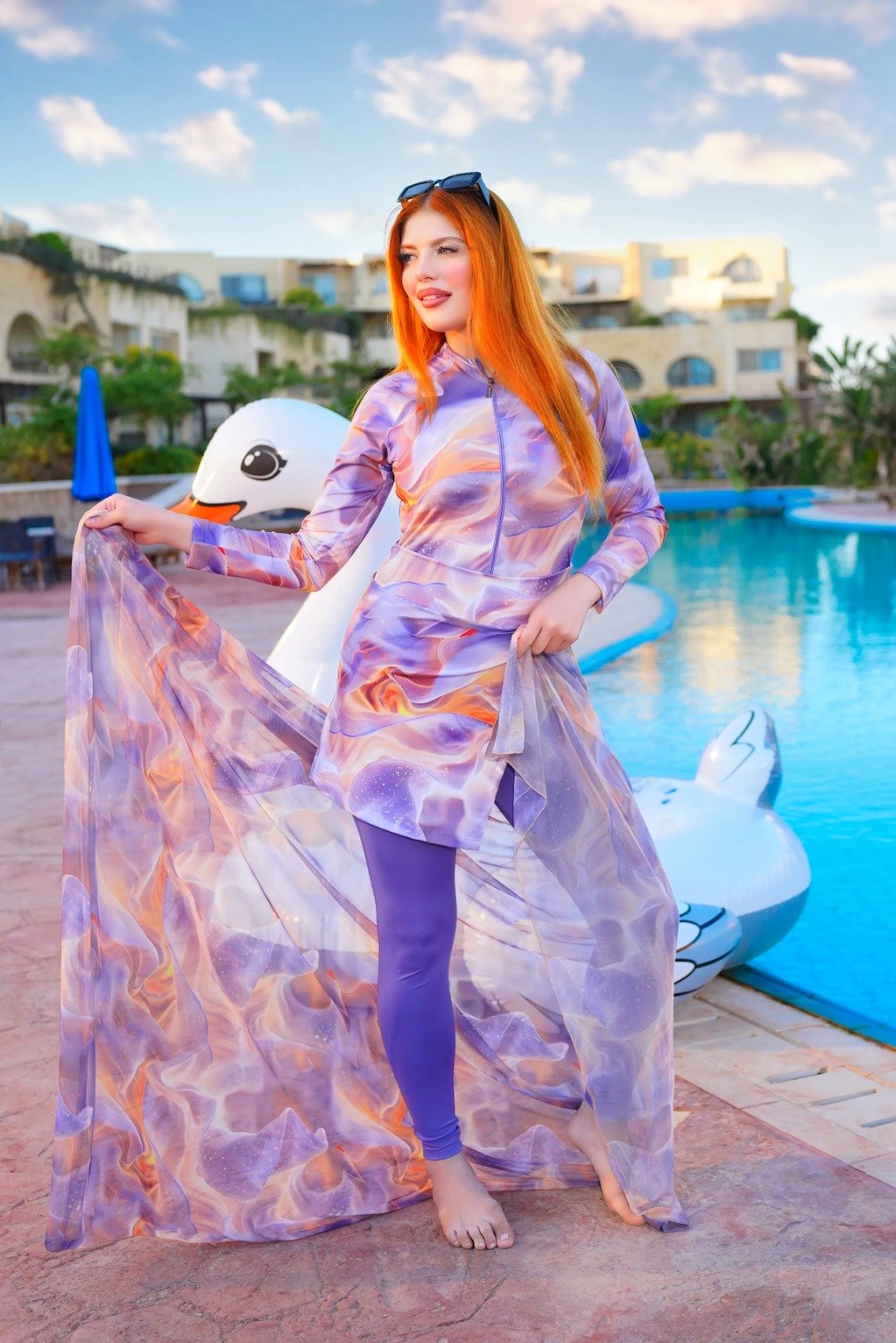 This stylish Burkini set includes a long-sleeved jumpsuit with a vibrant, colorful chest panel, a matching skirt, a head covering (bonnet), and a long cover-up dress.