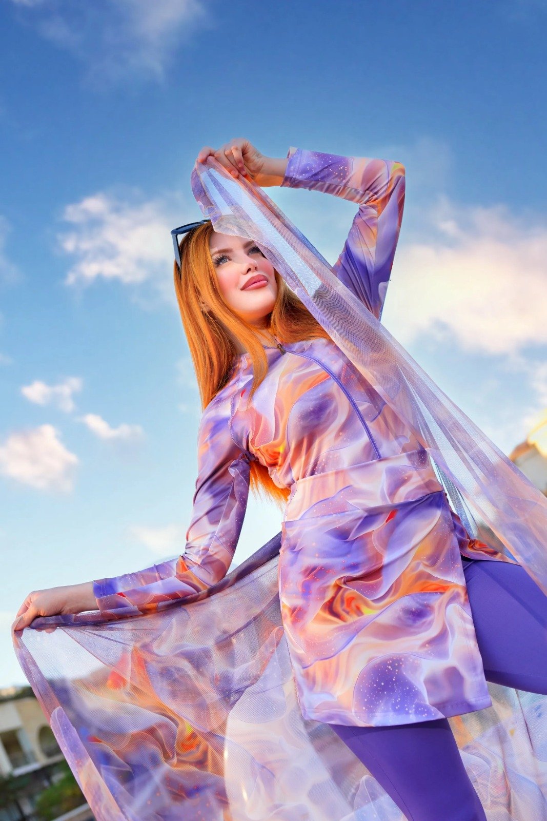 The fabric boasts a unique and eye-catching “galaxy” inspired print in shades of purple, blue, and pink.