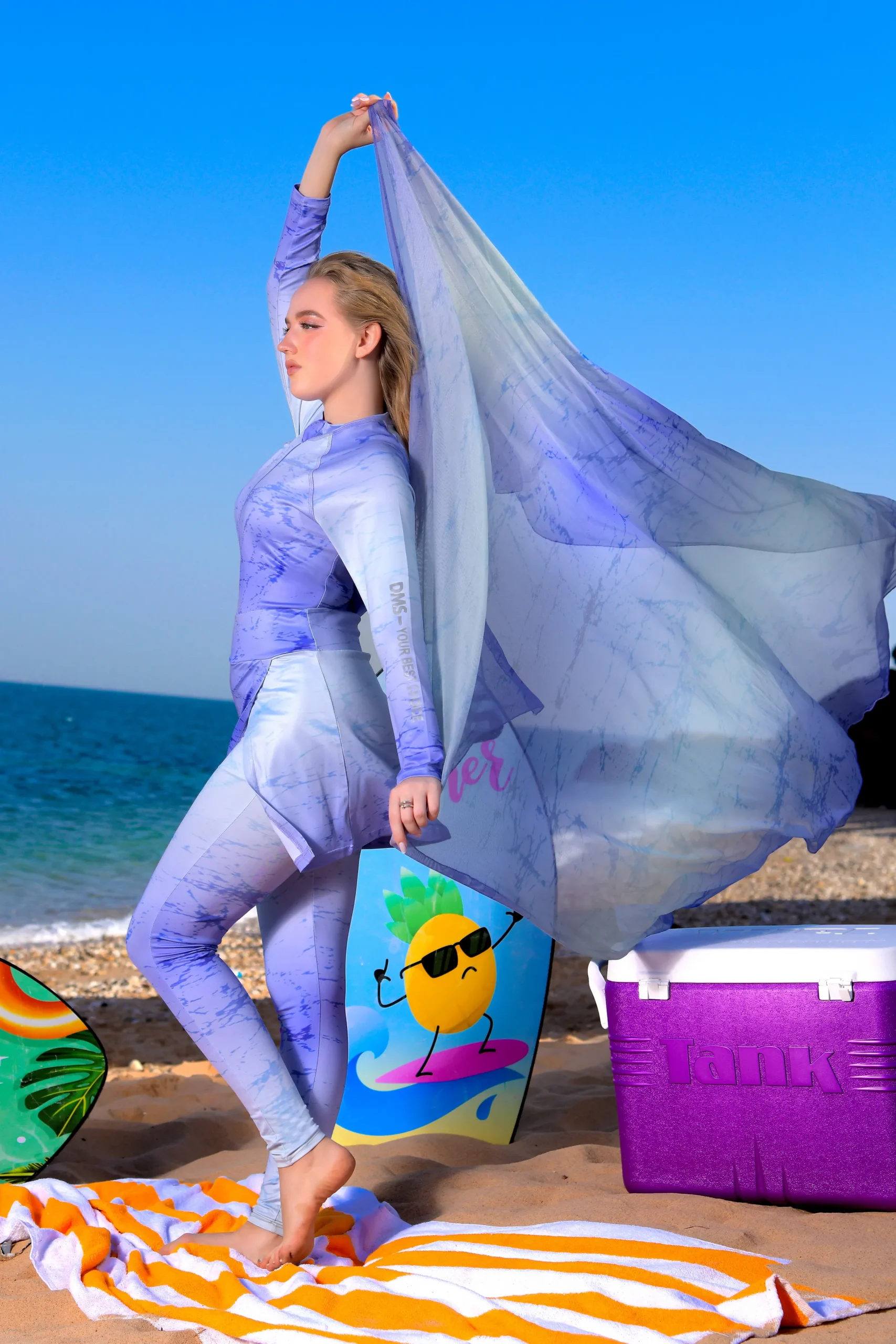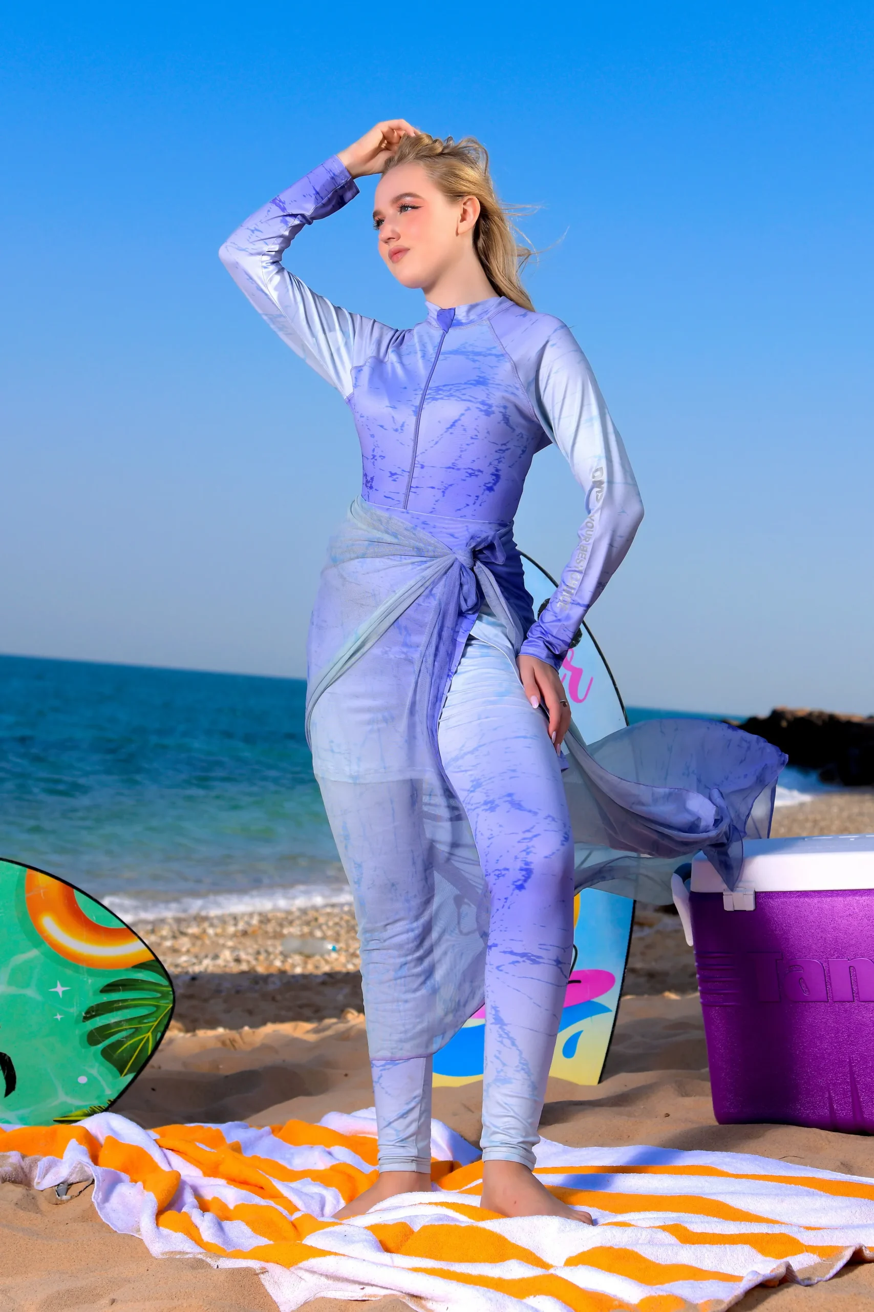 Dive into modesty and style with our exquisite 4-piece Burkini set, designed for comfort and confidence on every beach day.
