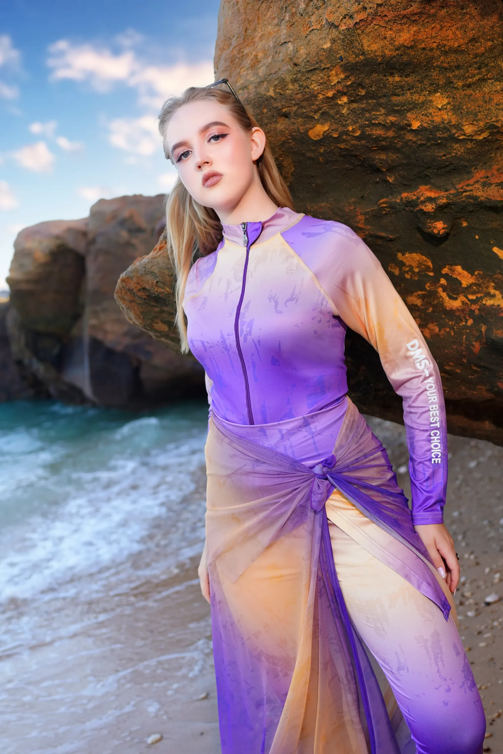 • 4-Piece Set: Includes a printed jumpsuit, skirt, cover-up (Cash Mayo) and head cover (bonnet).