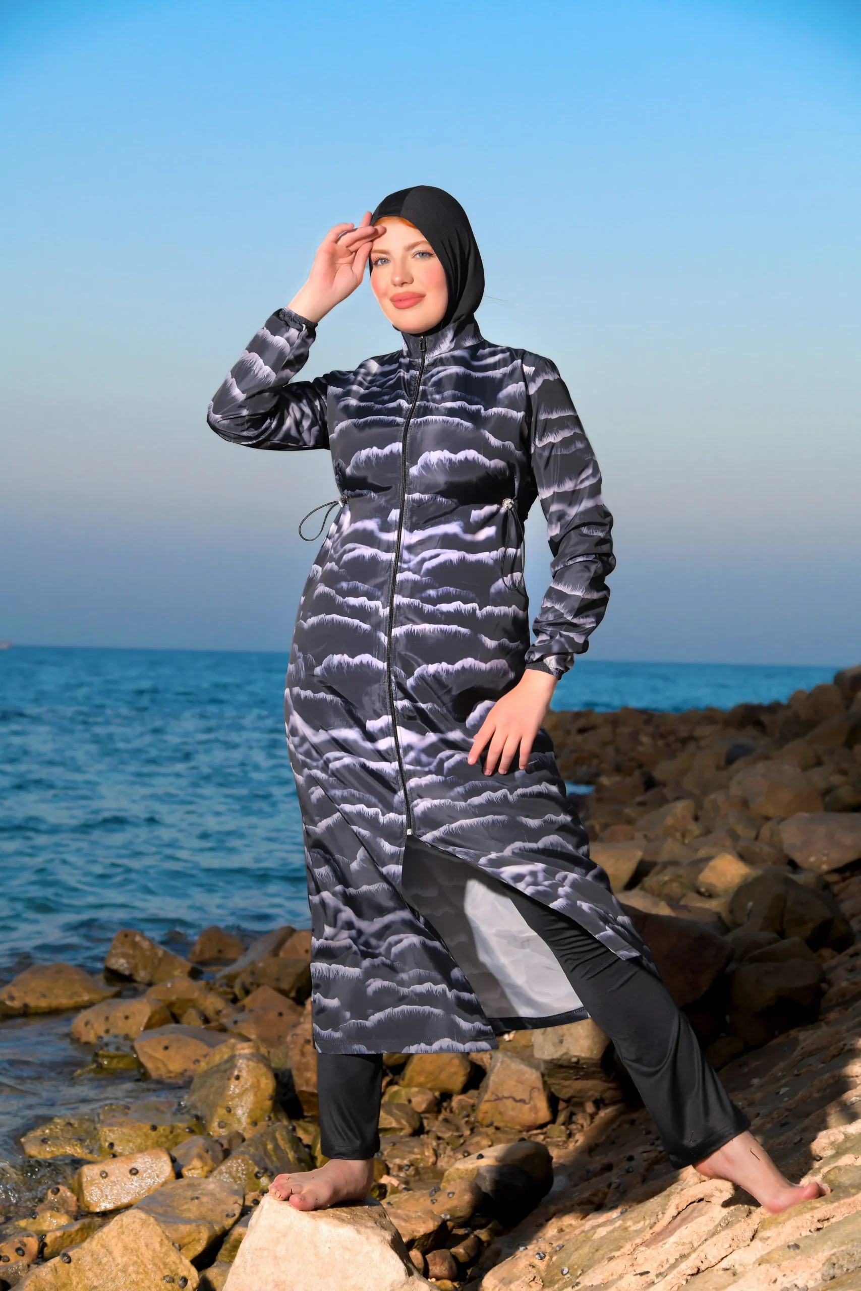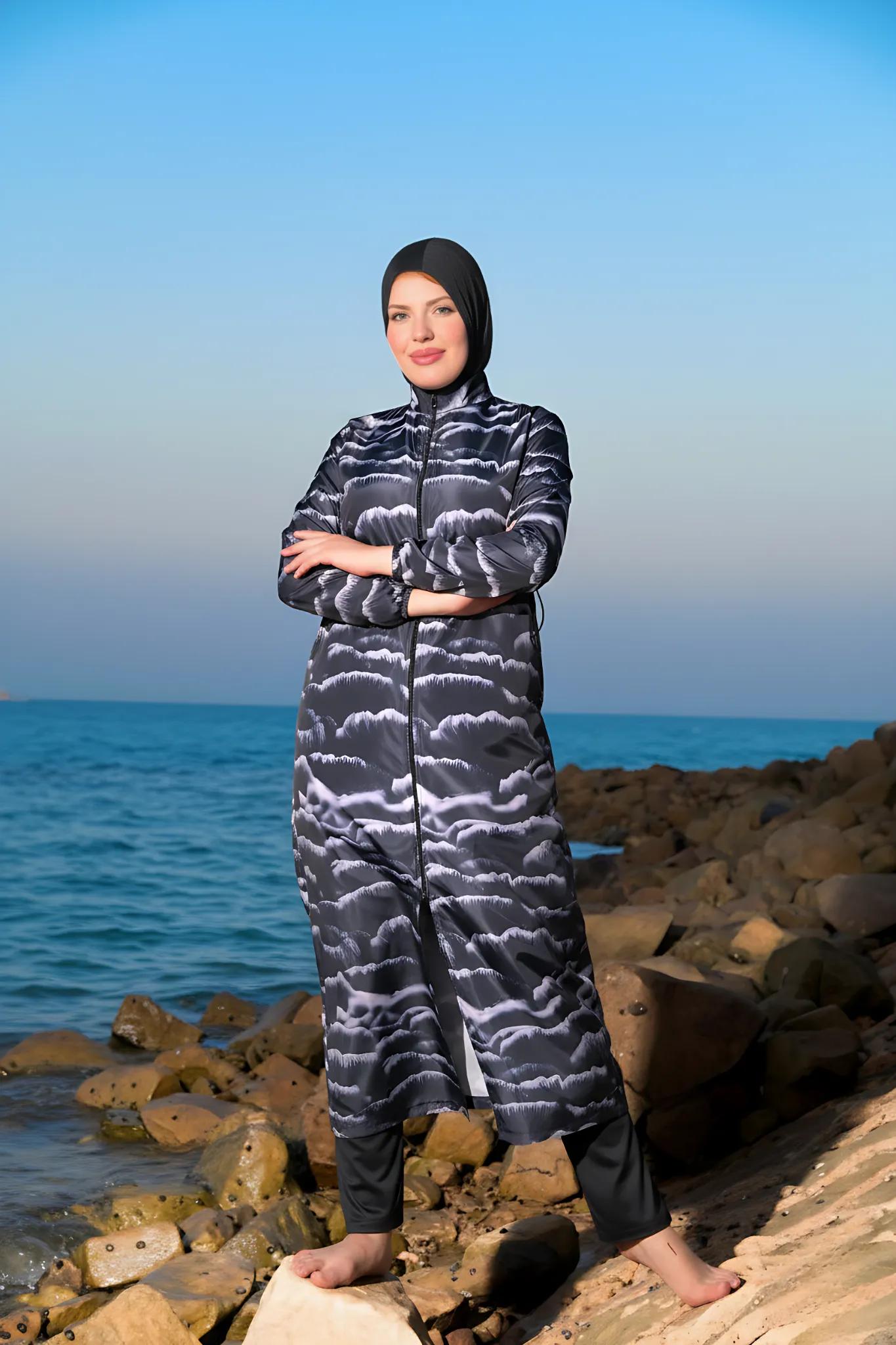 It includes a long, printed long dress, matching pants, a top, and a hijab.