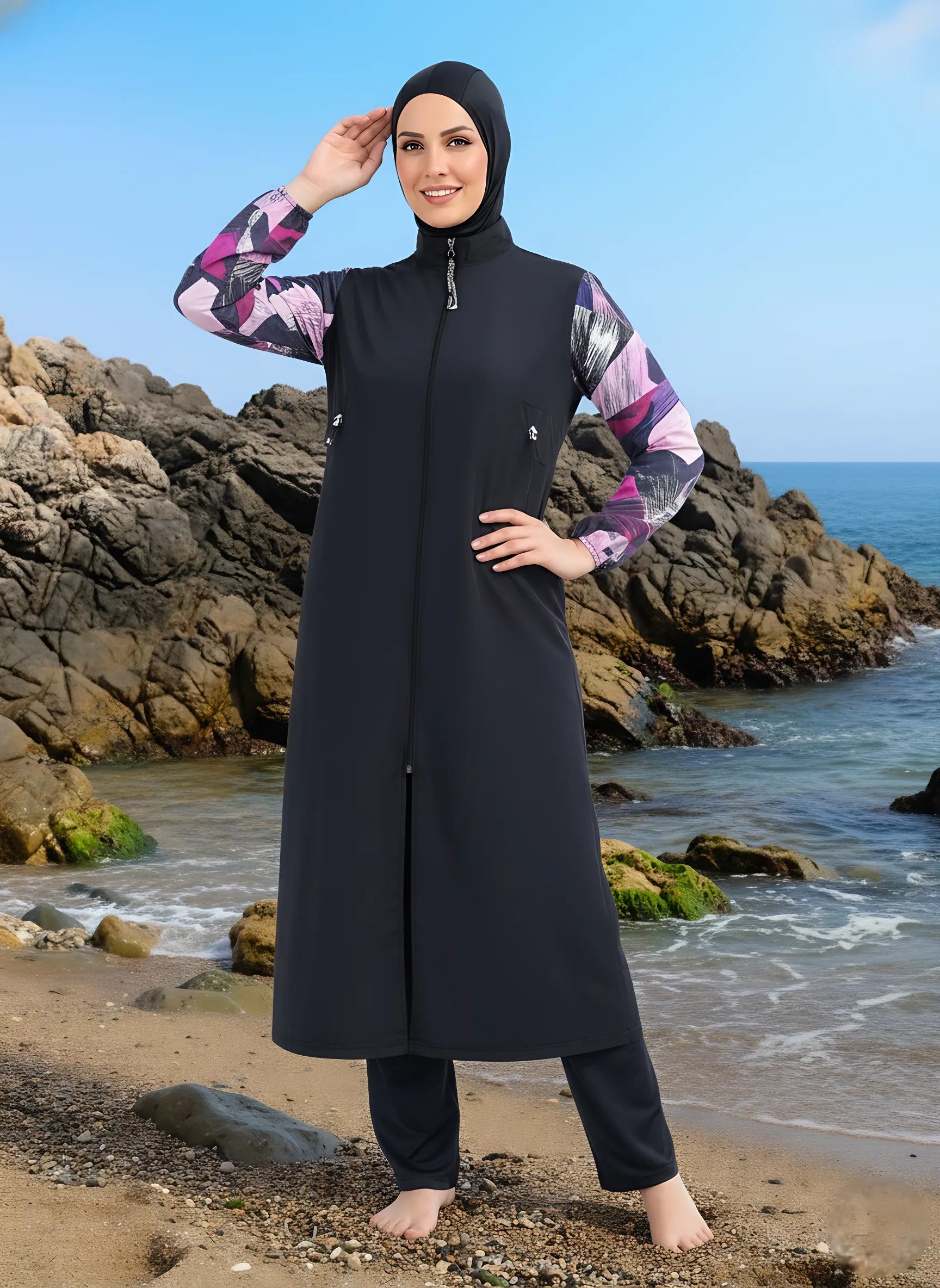 Chic 4-Piece Long Waterproof Burkini with Printed Sleeves