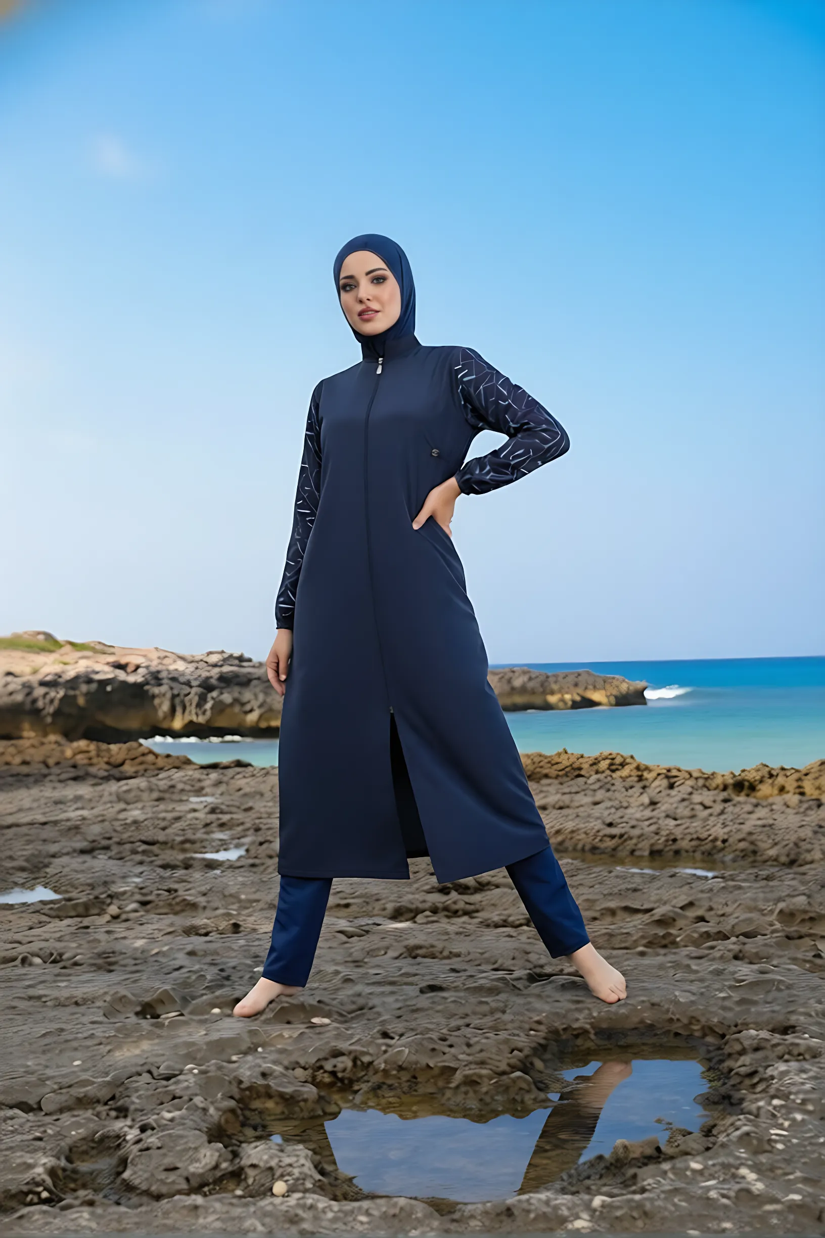 • 4-Piece Set: Includes a long plain tunic (drill) with beautiful printed sleeves, matching trousers, a comfortable inner top, and a swimming hijab.